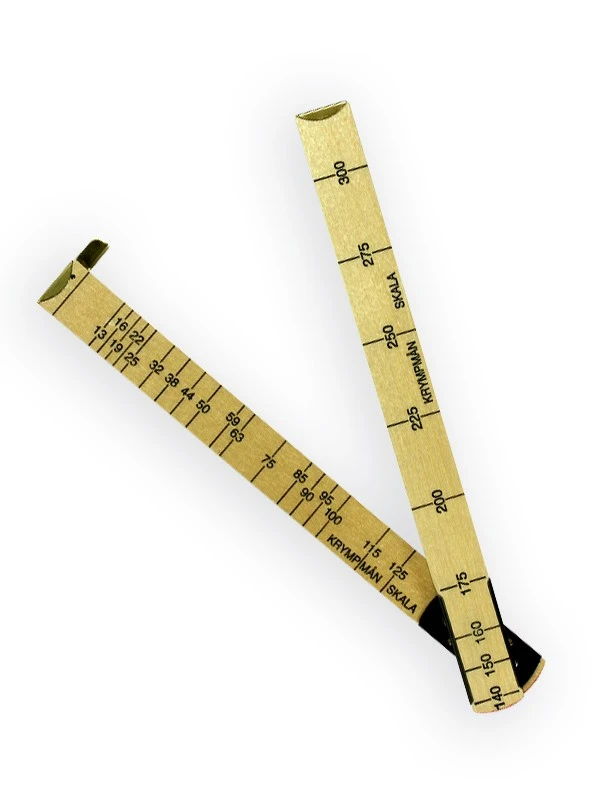 Puinen kuivumisvaramitta 1 mm – 30 cm, nivelellä. Toisella puolella asteitus 30 cm:ään saakka sekä punaiset merkit, joilla ilmoitetaan puun vakiomitoitukset. Toisella puolella märkämitat eli mitta keskimääräisen kutistumisvaran kanssa.