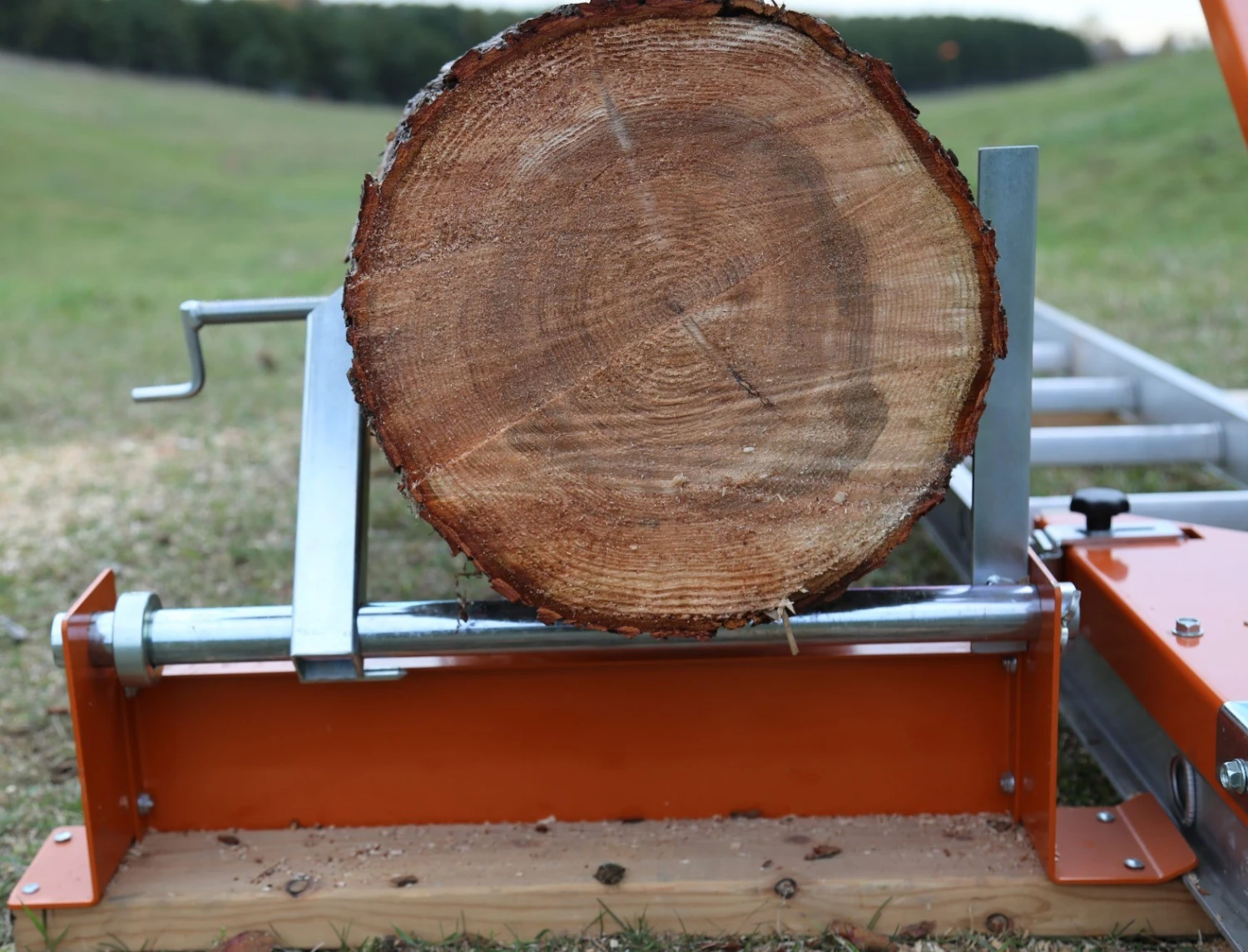 Norwood PortaMill PM14 sopiva tukinpuristin. Ruuvipuristin, jolla voi kiristää tukin tiukasti vastakappaletta vasten, kun tehdään ensimmäisiä sahauksia. Toisessa päässä ”piikki”, jonka voi painaa tukin alaosaan, kun sahataan lautoja. Suosittelemme, että yli 3,5 m:n tikkailla kannattaa olla 3 puristinta. Useampi puristin tuo vakautta sahaukseen.